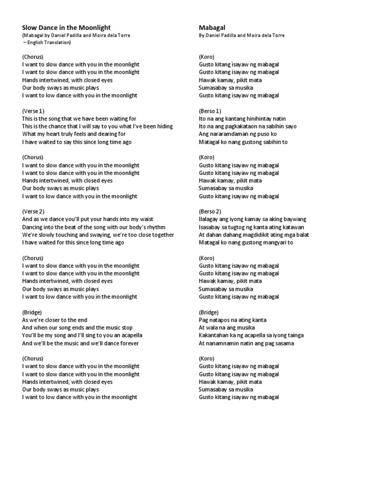 Gusto kitang isayaw nang mabagal Gusto kitang isayaw nang mabagal Hawak kamay Pikit mata Sumasabay sa musika Gusto kitang isayaw nang mabagal Ito na ang kantang hinihintay natin Ito na ang pagkakataon na sabihin sayo Ang nararamdaman ng puso ko Matagal ko nang gustong sabihin ito Gusto kitang isayaw nang mabagal Gusto kitang isayaw nang mabagal Hawak. Daniel Padilla Moira Dela Torre Mabagal Music Video. Ilalagay ang iyong kamay sa aking bewang.
